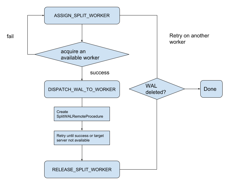During ServerCrashProcedure, SplitWALManager will create one SplitWALProcedure for each WAL file which should be split. Then each SplitWALProcedure will spawn a SplitWalRemoteProcedure to send the request to region server. SplitWALProcedure is a StateMachineProcedure and here is the state transfer diagram.