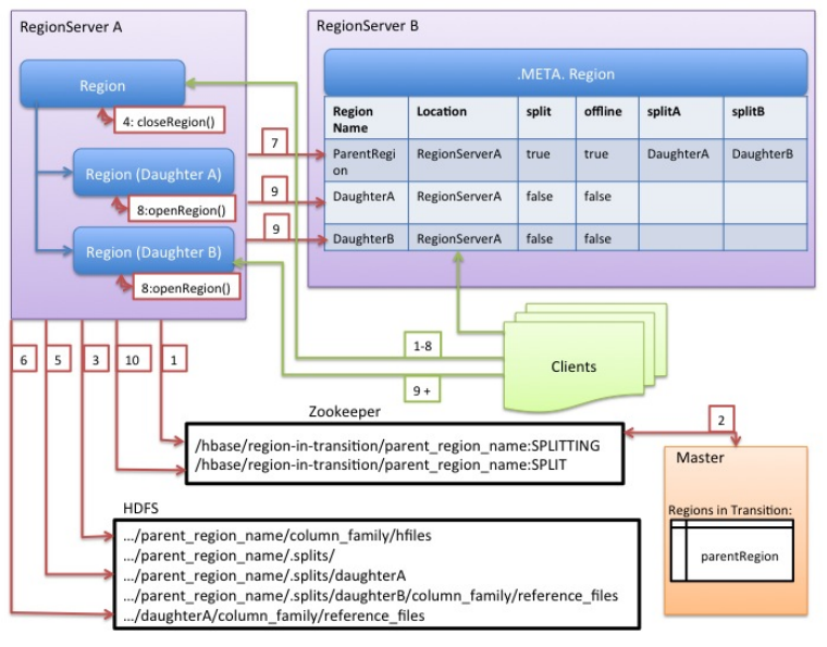 Although splitting the region is a local decision made by the RegionServer, the split process itself must coordinate with many actors. The RegionServer notifies the Master before and after the split, updates the .META. table so that clients can discover the new daughter regions, and rearranges the directory structure and data files in HDFS. Splitting is a multi-task process. To enable rollback in case of an error, the RegionServer keeps an in-memory journal about the execution state. The steps taken by the RegionServer to execute the split are illustrated in the "RegionServer Split Process" schema below. Each step is labeled with its step number. Actions from RegionServers or Master are shown in red, while actions from the clients are shown in green.